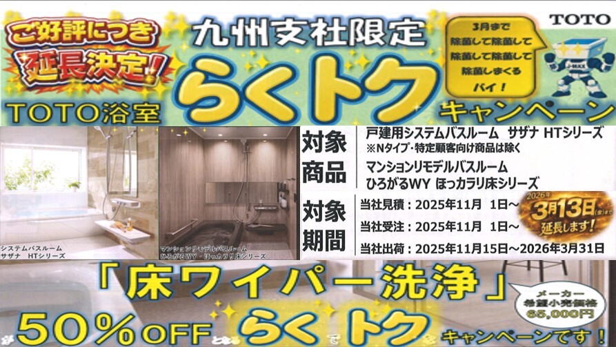 2026/2/9 【お知らせ】TOTO九州支社限定 浴室らくトクキャンペーン を更新しました♪